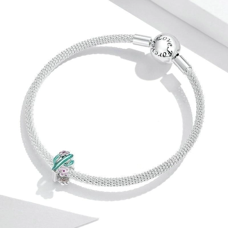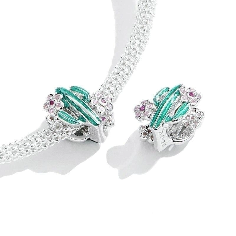Forjado em prata 925, este berloque em forma de cacto representa a beleza que não se curva ao tempo. As hastes verdes esmaltadas evocam resistência e autenticidade, enquanto as flores minuciosamente adornadas com zircônia rosa e vermelhos trazem leveza, doçura e cor ao que é árido.