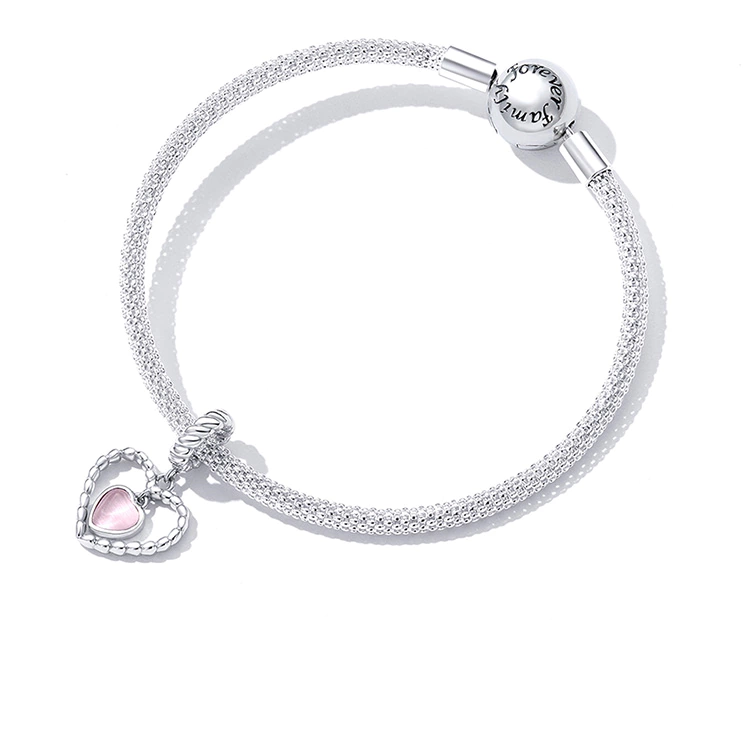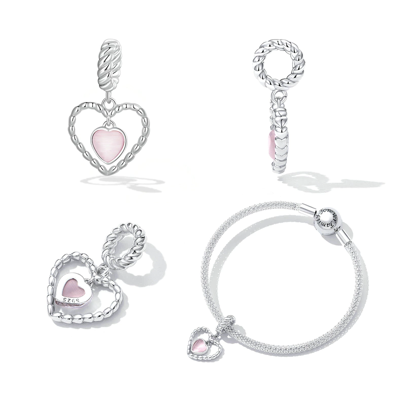 O berloque Coração Sereno combina a leveza do rosa-claro com o brilho prateado de um contorno delicadamente texturizado, como se cada curva tivesse sido moldada pelo toque da ternura.